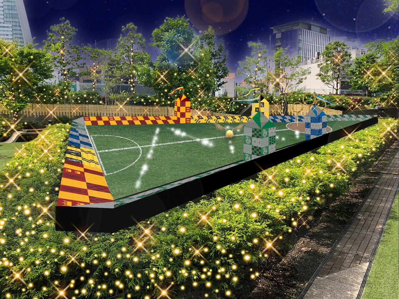 5階のスカイガーデンでは、高さ約4mの「天空のクリスマスツリー」がハリー・ポッター仕様になって登場するほか、ホグワーツ魔法魔術学校の4つの寮をイメージした巨大クリスマスリースや、LEDイルミネーションで金のスニッチを表現したクィディッチ競技場の装飾などが施され、空間全体で世界観を楽しむことができます。